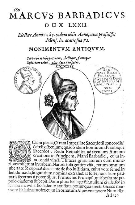 Description: A portrait of Venetian Doge Marco Barbarigo (c. 1413-1486), who reigned for nine months between 1485 and 1486. On Barbarigo’s coat of arms, a set of three beards appears on each side of a broad diagonal stripe, which contains three lions. The accompanying medal bears, on the front, a bust of the Doge, and on the reverse, a version of the inscription on Barbarigo’s tomb: “Ser vavi bello patriam morboqve fameqve ivstitiam fovi plvs dare non potvi”.