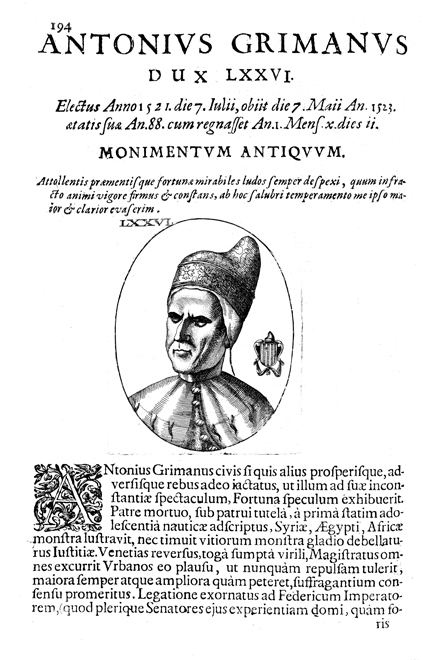 Description: A portrait of Venetian Doge Antonio Grimani (1436-1523), who reigned from 1521 to 1523. His coat of arms contains a pattern of vertical stripes.