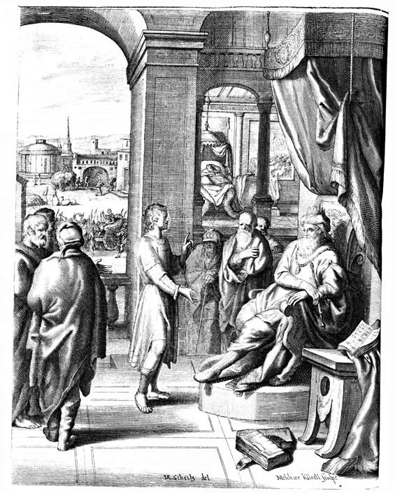Description: In the foreground, Pharaoh and Egypt’s premiere magicians and wise men listen with great wonder, as Joseph interprets Pharaoh’s dreams of the seven fat and seven lean cows, and the seven good and seven lean stalks (right background). As a result, Joseph is promoted to vice-regent in Egypt, and given Pharaoh’s chariot with which to ride throughout the land, (background left). The artist’s name, Matthias Scheits' (c. 1630-1700), is located at the bottom center portion of the woodcut, alongside the engraver’s name, Melchior Kussell (1626 - c.a. 1683), in the bottom right corner.