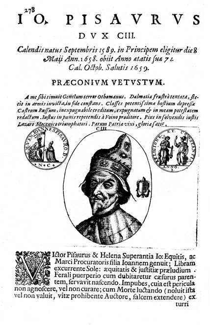 Description: A portrait of Venetian Doge Giovanni Pesaro (1589-1659), who reigned from 1658 to 1659. The medal on this page, Pesaro’s only osella, depicts him on the obverse receiving the Venetian Republic’s banner from Saint Mark. The mintmaster, Nicolo Contarini, has placed his initials at the bottom center. The reverse depicts Religion (left) as a woman bearing a cross on her right should and holding a censer in her left, along with Constancy (right), a man propping up a spear in his left hand and pointing upward with his right.