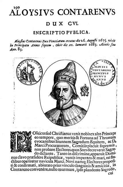 Description: A portrait of Venetian Doge Alvise Contarini (1601-1683), who reigned from 1676 to 1683. The medal on this page, Contarini’s 1676 osella, depicts Doge Contarini on the obverse, humbly accepting the banner of the Venetian Republic from Saint Mark. The mintmaster, Agostino Zolio, has his initials placed at the bottom center. The reverse contains a simple legend commemorating the first year of the Doge’s reign; the circumscribing inscription.