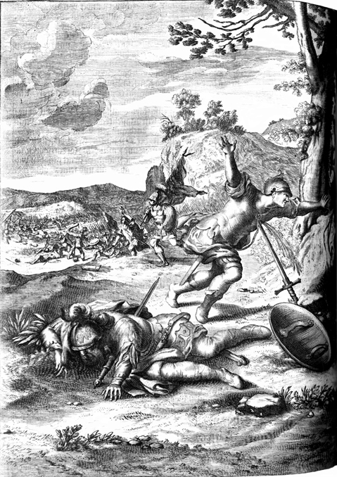 Description: Matthias Scheits' (c. 1630-1700) depiction of Saul falling on his sword so as not to be taken prisoner by the Philistine army.