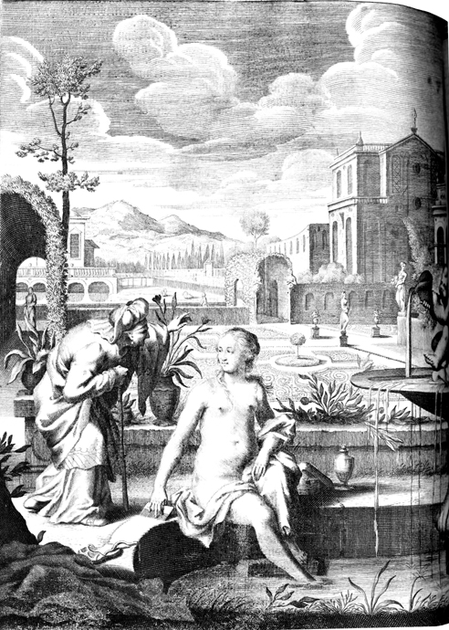 Description: Matthias Scheits' (c. 1630-1700) depiction of David watching Bathsheba bathe from the balcony of the palace.