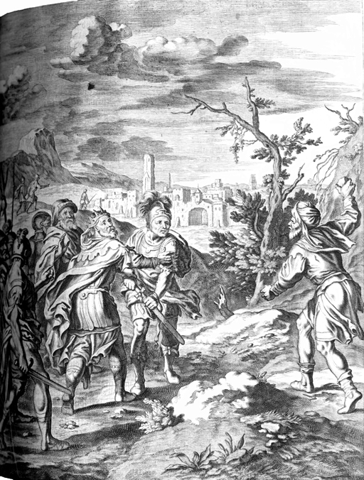 Description: Matthias Scheits' (c. 1630-1700) depiction of David preventing Abishai from murdering Shimei as Shimei curses David and pelts him and his soldiers with stones.