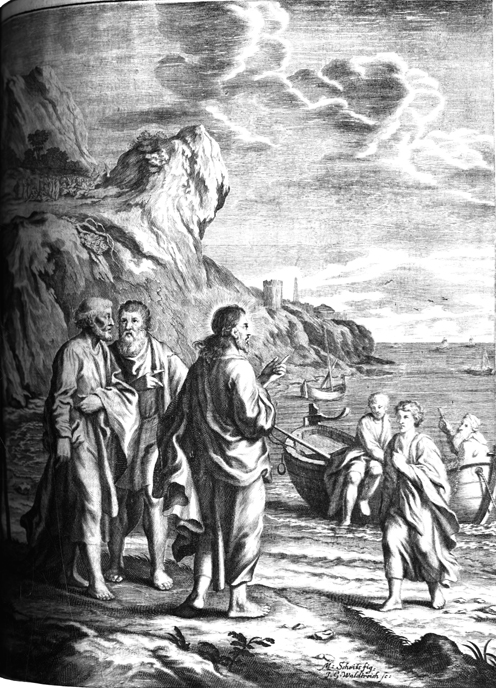 Description: Matthias Scheits' (c. 1630-1700) depiction of Jesus calling his first disciples from their fishing boats on the Sea of Galilee; in the background, Jesus delivers the Sermon on the Mount.