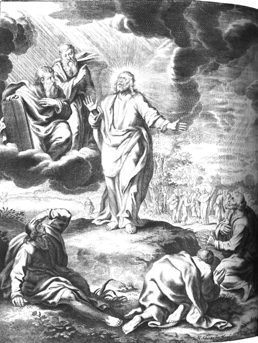 Description: Matthias Scheits' (c. 1630-1700) depiction of Jesus being transfigured in the presence of Moses, Elijah, Peter, James, and John (front); in the background Peter is given the keys to heaven.