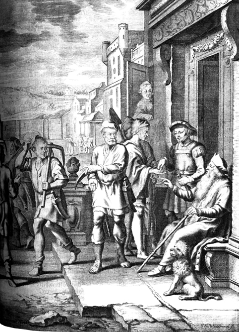Description: Matthias Scheits' (c. 1630-1700) depiction of the landowner paying the hired hands for the day of work in the vineyard (front); in the background workers labor in the vineyard as the landowner hires others to work in his vineyard.