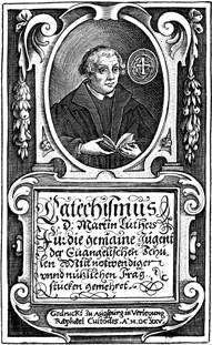 Description: A portrait of Martin Luther (1483-1546), preeminent German theologian and Protestant reformer from the title page of a 1625 printing of the Luther’s Small Catechism .