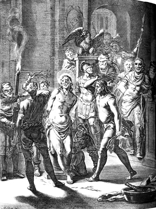 Description: Matthias Scheits' (c. 1630-1700) depiction of Jesus being flogged by the Roman soldiers with flagellums.