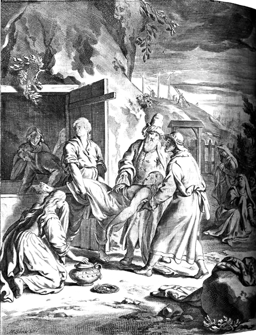 Description: Matthias Scheits' (c. 1630-1700) depiction of Jesus being buried by Joseph of Arimathea (front); the crosses can be seen in the background.