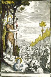 Description: Holding a cruciform staff wrapped with a banner, John the Baptist preaches to a large crowd from an embankment. A lamb representing Christ rests at his feet .