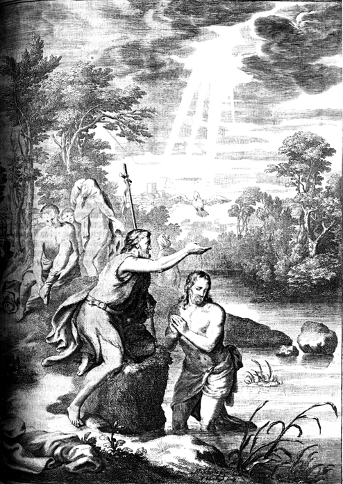 Description: Matthias Scheits' (c. 1630-1700) depiction of John the Baptist baptizing Jesus in the Jordan River; the Holy Spirit appears overhead in the form of a dove.
