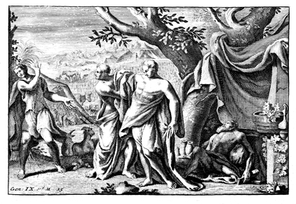 Description: Ham dishonors Noah by pointing out his nakedness, but Shem and Japheth cover their father with a sheet.