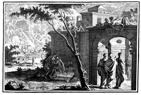 Description: As Sodom and Gomorrah are destroyed (background, two angels escort Lot’s family out of Sodom and Gomorrah and to the city of Zoar.
