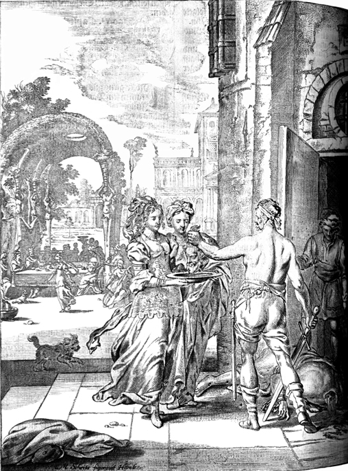 Description: Matthias Scheits' (c. 1630-1700) depiction of John the Baptist's head being placed on a platter and given to Salome (front); in the background, Salome dances for King Herod and his guests.