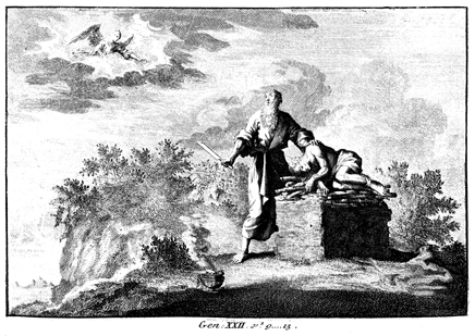 Description: After witnessing Abraham’s faith, an angel prevents him from sacrificing his son Isaac to God and supplies a ram (background center) instead for the sacrifice.