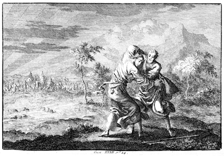 Description: After sending his family ahead of him (background), an angel appears to Jacob and wrestles with him throughout the night.