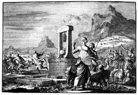 Description: Moses helps Reuel's daughters at the well of Midian.