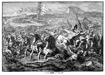 Description: As Moses and Israelites stand safely on the shore, Pharaoh's army is drowned in the Red (Reed) Sea.