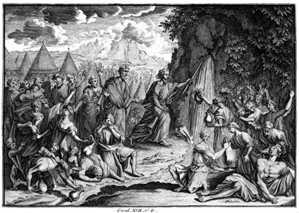 Description: Moses brings water from the rock at Meribah by following God’s command to strike the rock with the staff he used at the Nile.