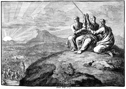 Description: Aaron and Hur hold up Moses' hands, enabling Joshua to defeat the Amalekites.