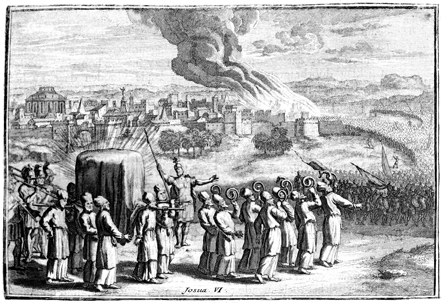 Description: The walls of Jericho begin to fall, as the Israelites march around the city with the Ark of the Covenant and blow their trumpets.