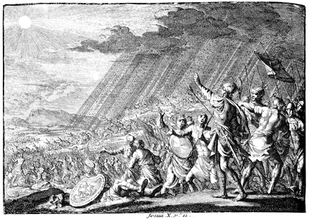 Description: Israel defeats the Amorites at Gibeon with the help of God, who rains down stones upon the Amorites and causes the sun and the moon to stand still.