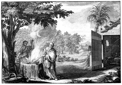 Description: Fire from God consumes Gideon’s sacrifice beneath an oak tree, after an angel touches it with his staff.