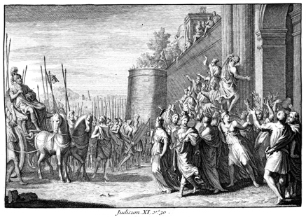 Description: Jephthah’s daughter is the first to greet him from Mizpah, when he returns from victory.