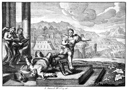 Description: As the Philistines and Israelites battle in the background, Eli falls and breaks his neck after hearing the Ark of the Covenant was captured in battle.