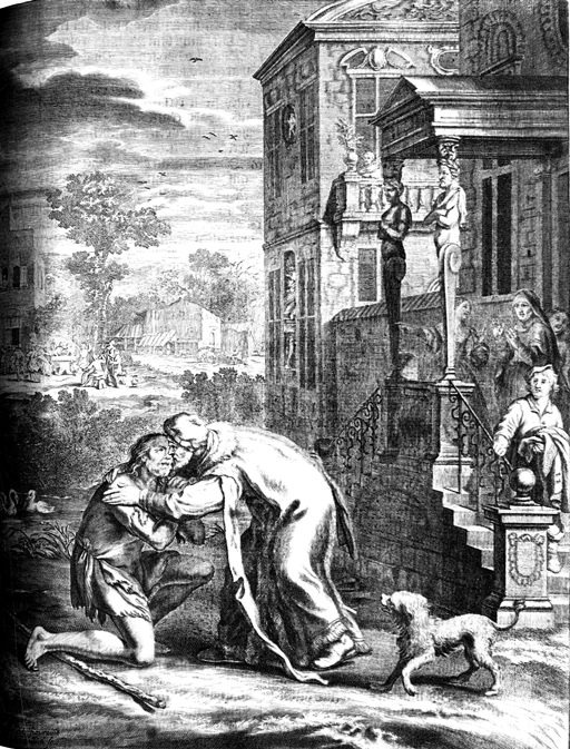Description: Matthias Scheits' (c. 1630-1700) depiction of the father welcoming the prodigal son home (front); in the background he squanders his wealth, and ends up tending pigs.