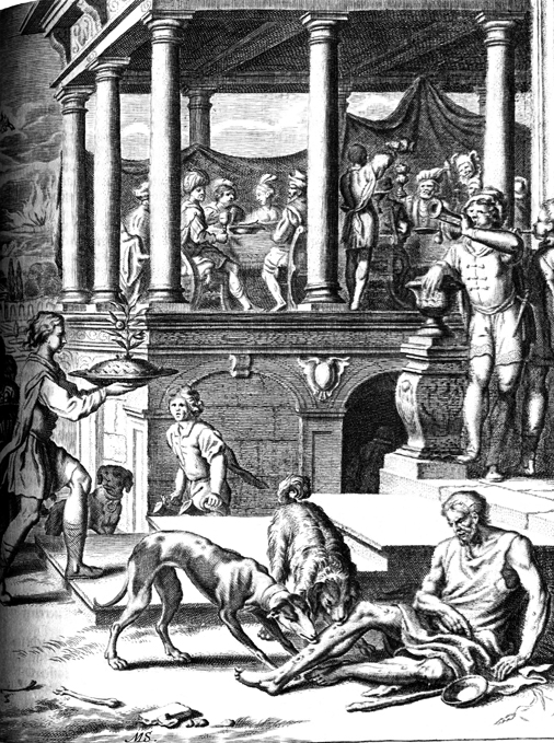 Description: Matthias Scheits' (c. 1630-1700) depiction of Lazarus sitting at the gate of the rich man, who lives in luxury. In the rear, the rich man begs Abraham to allow Lazarus to put water on his tongue to quench his torment.