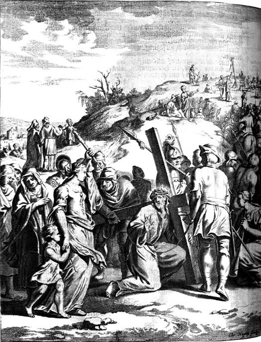 Description: Matthias Scheits' (c. 1630-1700) depiction of Jesus tells the women of Jerusalem not to cry for him as he falls under the weight of the cross; Simon of Cyrene is forced to carry Jesus' cross.