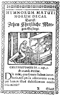 Description: In this print, a Christian prays at his bedside during the liturgical hour of Matins, a scene which is used as the title-image of the section of Joseph Clauder’s (1596 – 1653 CE) Psalmnodia novae pars nova: sive selectissimorum hymnorum centura II compromised of ten hymns appropriate for use in the canonical hour of Matins .