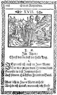 Description: This woodcut print features a rendering of the “Parable of the Good Samaritan” told by Jesus. The good Samaritan is in the foreground of the image; and the man whom the Samaritan saves is in the background being attacked by robbers. This scene is used as the title-image of the section of the Lutheran hymnist Joseph Clauder’s (1586 – 1653 CE) Psalmnodia novae pars nova: sive selectissimorum hymnorum centura II dedicated to the theme of the Christian life as a sojourn to the heavenly Jerusalem.