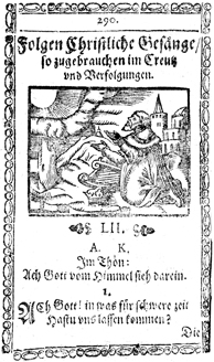 Description: This woodcut print features a man giving praise to God, having laid down his harp and crown to do so, a gesture of exultation in renunciation for the sake of the Kingdom of God. This scene is used as the title-image of the section of the Lutheran hymnist Joseph Clauder’s (1586 – 1653 CE) Psalmnodia novae pars nova: sive selectissimorum hymnorum centura II dedicated to the themes of the believer’s crucifixion with Jesus and the suffering of persecution .