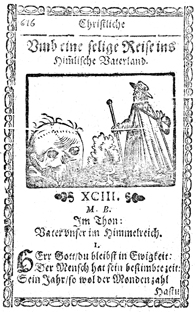 Description: This woodcut print features a pilgrim walking past a human skull, a scene which is used as the title-image of the section of the Lutheran hymnist Joseph Clauder’s (1586 – 1653 CE) Psalmnodia novae pars nova: sive selectissimorum hymnorum centura II dedicated to the theme of the pious soul’s journey to God’s heavenly kingdom after death.