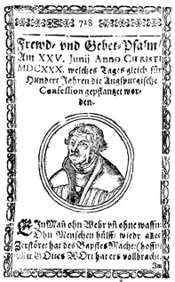 Description: A medallion portrait of Martin Luther (1483-1546 CE) on the title-page of a Centennial Celebration of the Augsburg Confession in 1631. The Lutheran hymnist Joseph Clauder’s (1586-1653 CE) "Psalmnodia novae pars nova: sive selectissimorum hymnorum centura II" is dedicated to the celebration of the anniversary of the presentation of the Augsburg Confession on June 25th, 1530.
