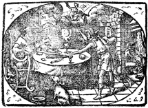 Description: This engraving depicts a pleasant repast in the month of January. In the fire-warmed abode, two servants and an expectant dog attend the lord and lady’s table. Above, Aquarius is shown bearing an urn of water; his zodiac sign appears next to him .