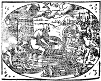 Description: Three men remove their footwear and prepare for the joyous occasion of treading grapes after the autumn grape harvest. Above the scene appear the scales of Libra .