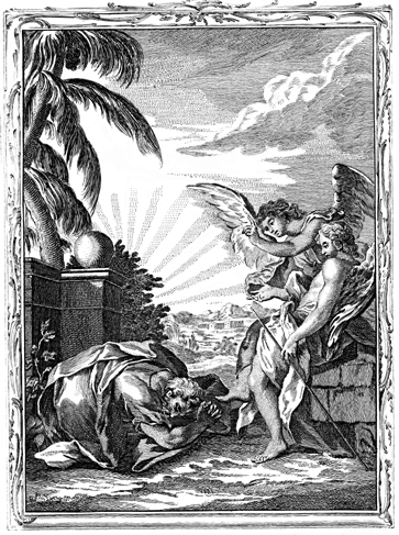 Description: As Lot bows before the angels, they urge him and his family to leave the city before God destroys it.