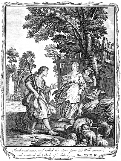 Description: Upon seeing Rachel for the first time, Jacob, with help from the shepherds of Haran, removes the stone from the well and waters her flock.