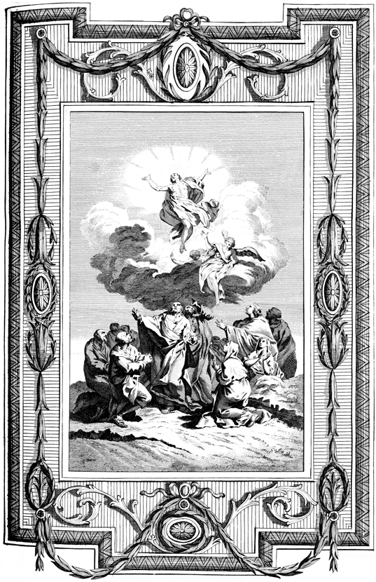 Description: Christ ascends into heaven, as a crowd of apostles and women watch in awe.