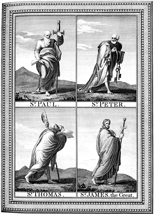 Description: This image shows Sts. Paul, Peter, Thomas and James the Great with items typically associated with their life or death.