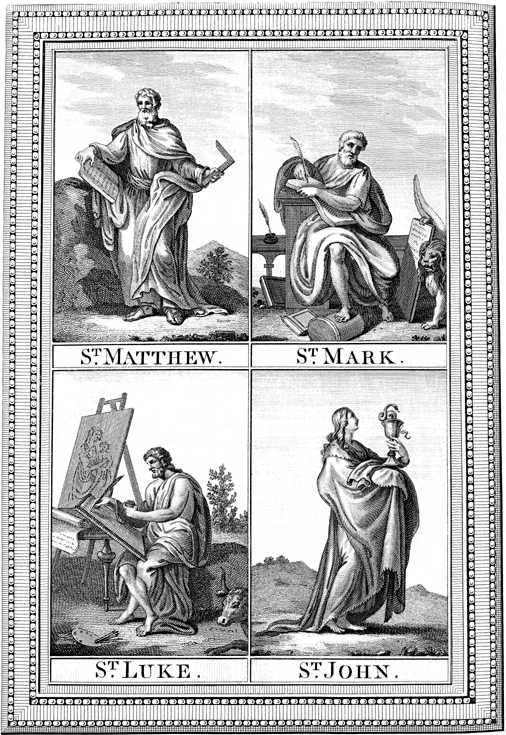 Description: This image shows Sts. Matthew, Mark, Luke and John with items typically associated with their lives.