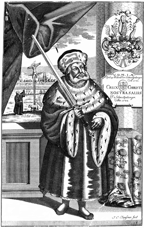 Description: An image of Frederick III, also known as Frederick the Wise, the Elector of Saxony (r. 1486-1525). Frederick is shown holding a sword, standing before an image of the crucifixion, with his coat of arms to the right. In the background is Martin Luther (1483-1546) standing at the foot of the Cross with the Words "Ecce Ecce", meaning "Behold, Behold".