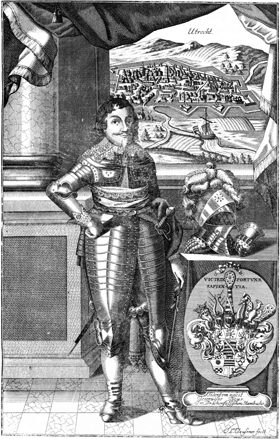 Description: An image of Frederick of Saxe-Weimar, a son of John II, the Duke of Saxe-Weimar (r. 1602-1605). Frederick’s coat of arms is to the right. Frederick would be killed in 1622 at the Battle of Fleurus in Belgium, fought as part of the Thirty Years War.