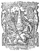 Description: In this woodcut print, the artist depicts the Apostle Matthew inscribing his gospel on a tablet held by an angel.