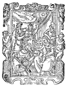 Description: In this woodcut print, the artist depicts the magi presenting to Jesus gifts of gold, frankincense, and myrrh.