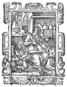Description: In this woodcut print, the artist depicts Luke sitting on a bull, a traditional symbol of the gospel writer, while he pauses from writing to look out a window at what appears to be a pyramid.